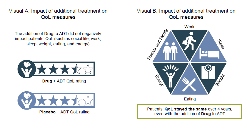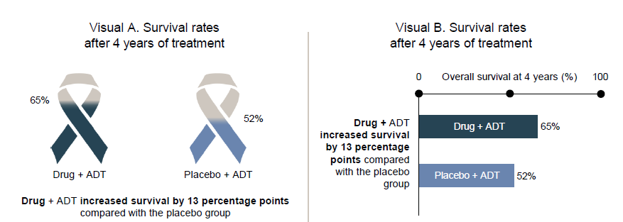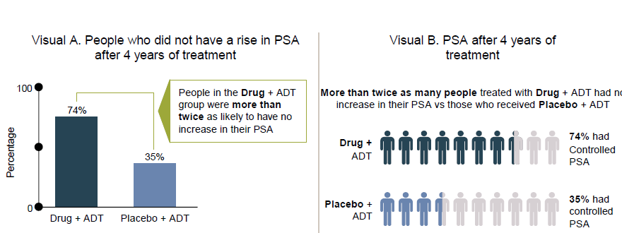 With that question in mind, Johnson & Johnson Innovative Medicine partnered with ZERO Prostate Cancer — a patient advocacy group and their membership, buzzback and ENTRADA to understand how to improve the ways scientific data are presented.1 With special attention to health literacy and socioeconomic consideration, the goal was to create easily interpretable visualizations comparing their drug to a placebo across four different categories of patient outcomes (efficacy, prostate-specific antigen (PSA) level, safety and quality of life).